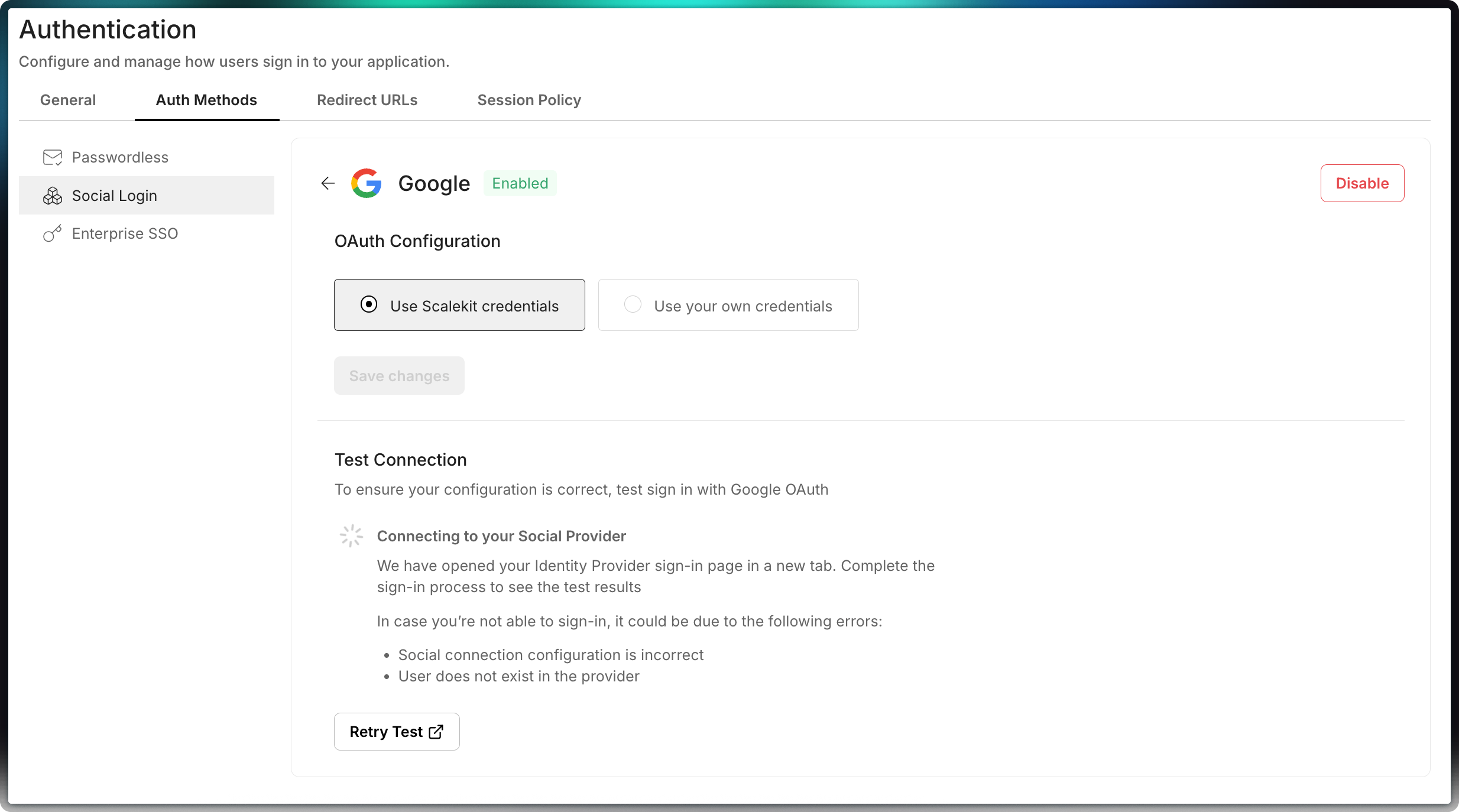 First, complete the quickstart guide to integrate Scalekit auth into your application. Scalekit natively supports OAuth 2.0, enabling you to easily configure social login providers that will automatically appear as authentication options on your login page.