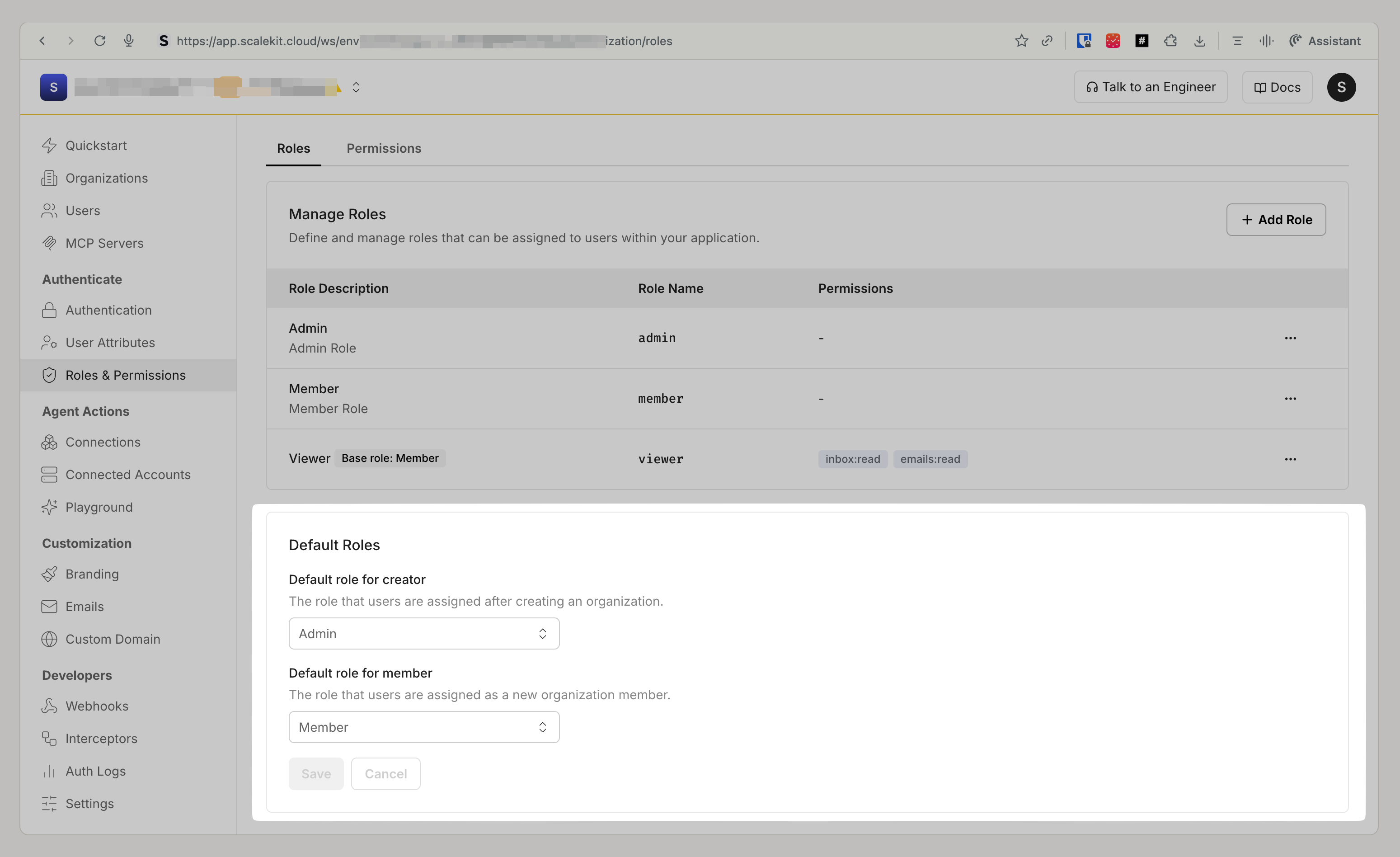 Section titled “Set a default role for new organization members”You can also configure a default role that is automatically assigned to users who join a specific organization. This organization-level setting overrides the application-level default role described above, allowing finer-grained control per organization.