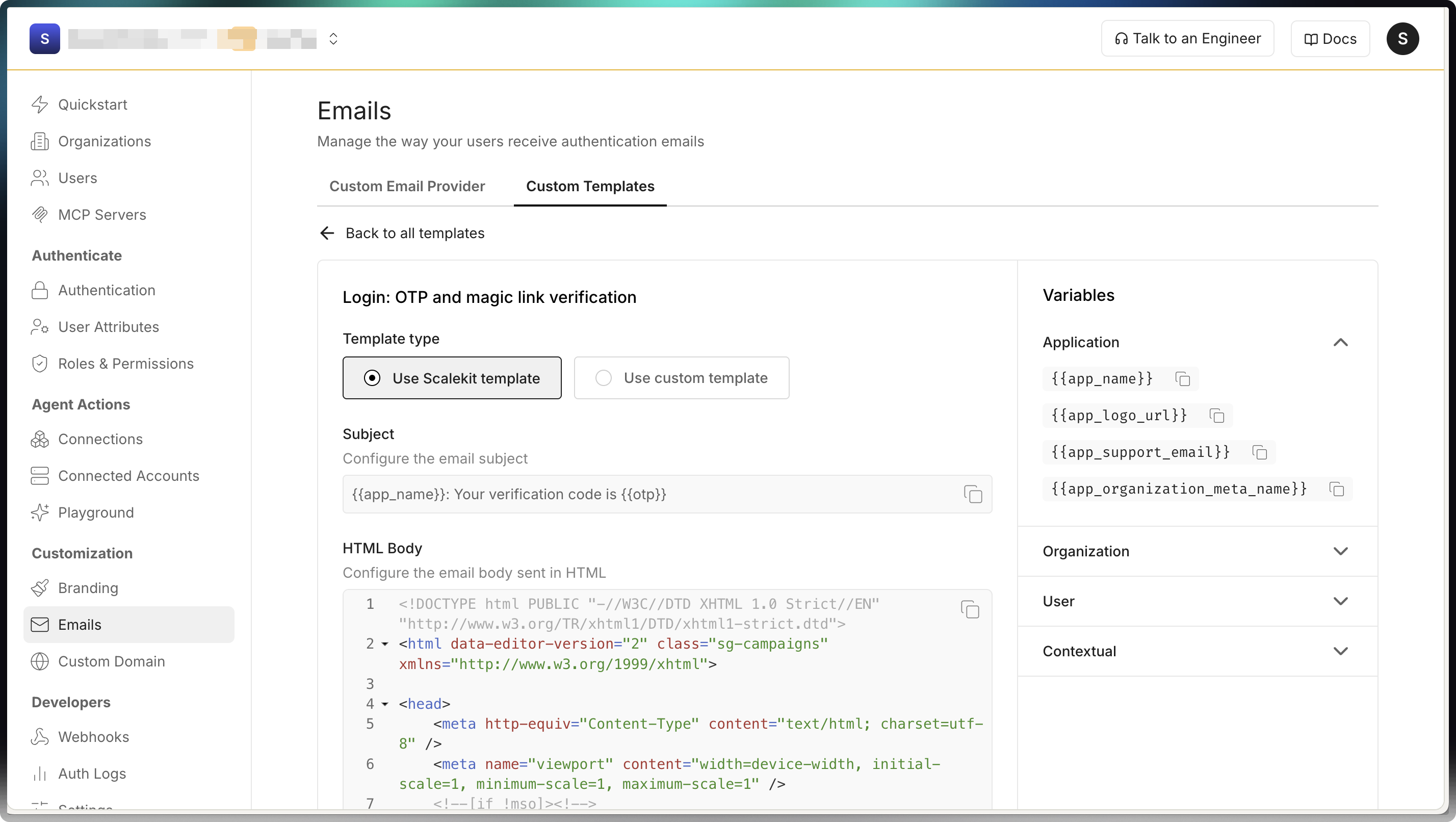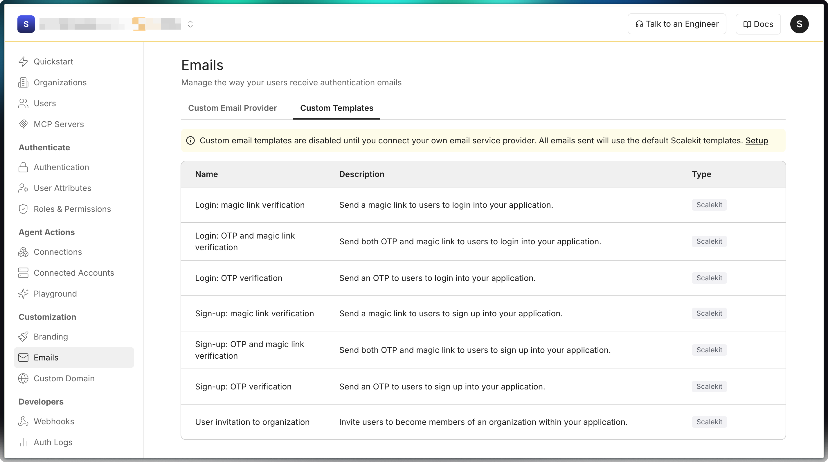 Select one of the listed templates and choose between Scalekit’s default templates or your own custom templates.