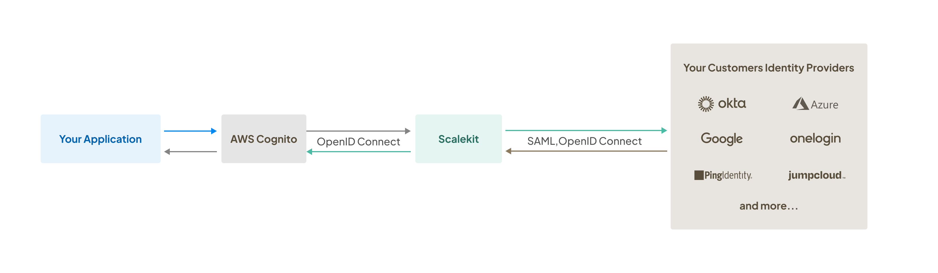 Expand your existing AWS Cognito authentication system by integrating Scalekit as an OpenID Connect (OIDC) provider. This integration enables enterprise users to log into your application seamlessly using Single Sign-On (SSO).