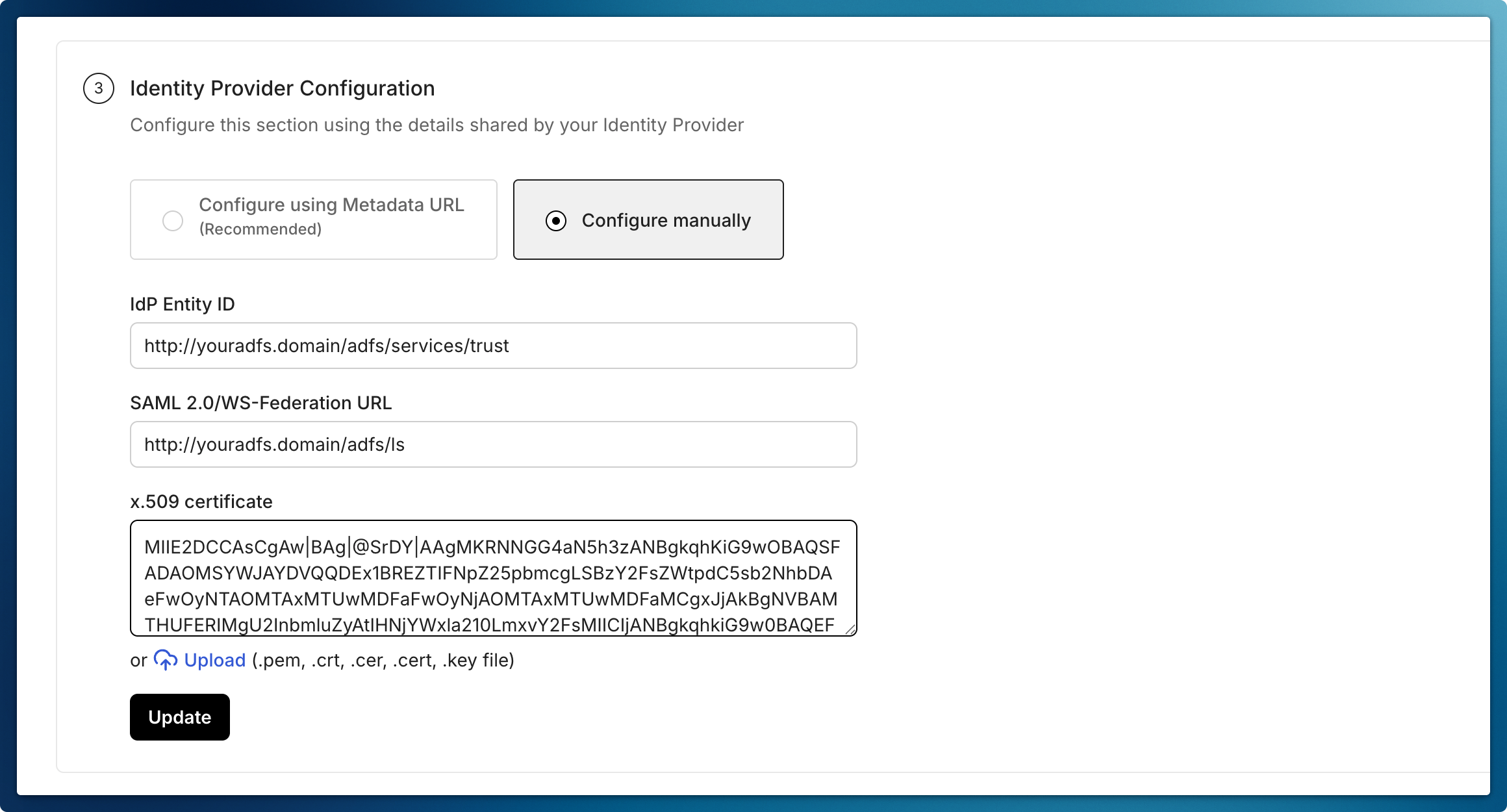 This guide walks you through configuring Single Sign-On (SSO) with Microsoft Active Directory Federation Services (AD FS) as your Identity Provider.
